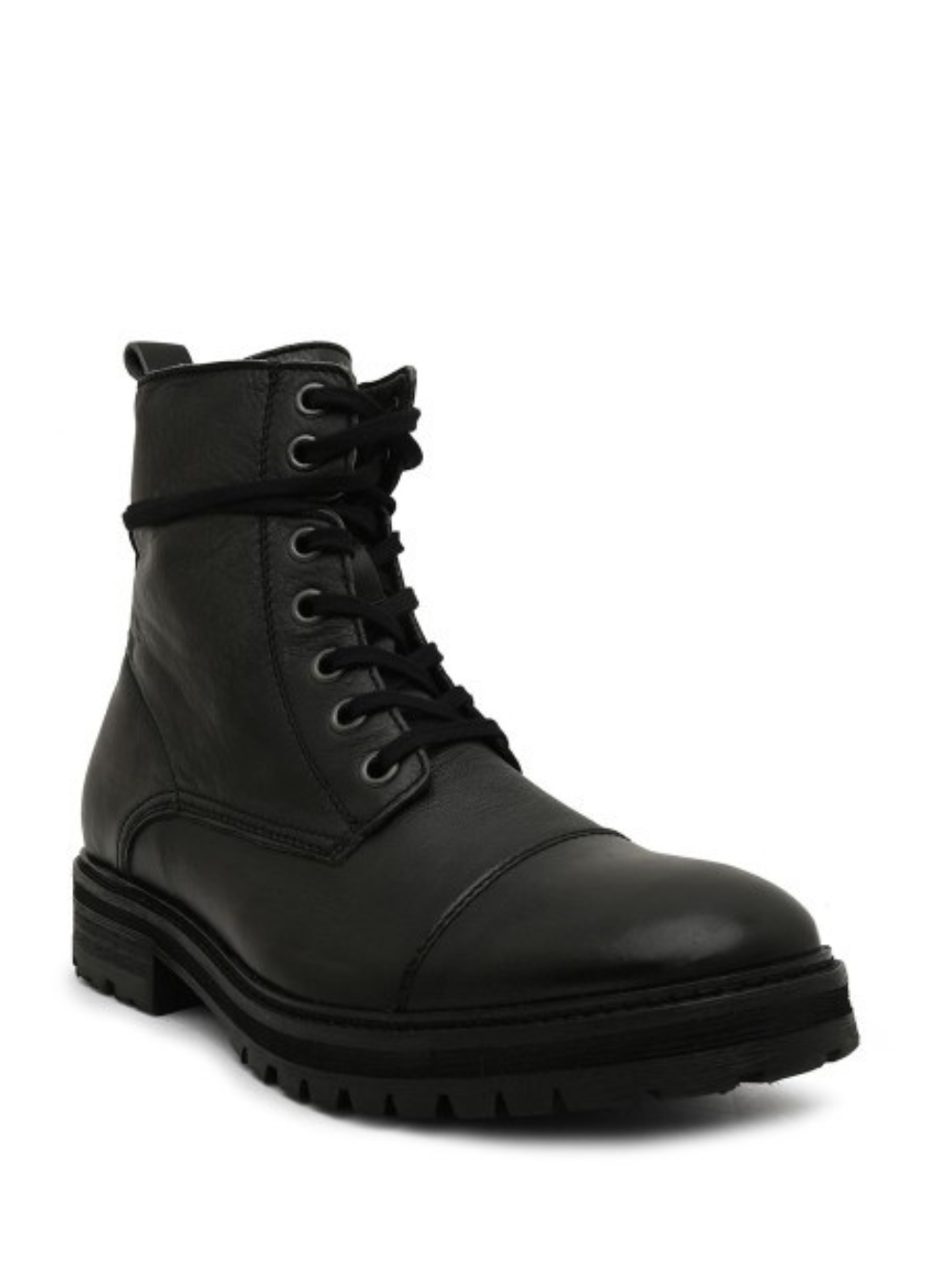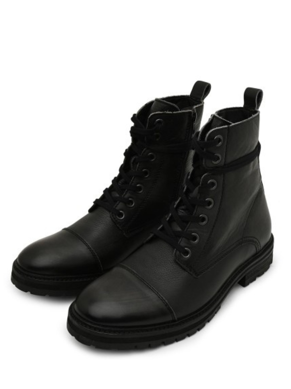 A pair of black regular boots, has regular and lace up closure and back detail